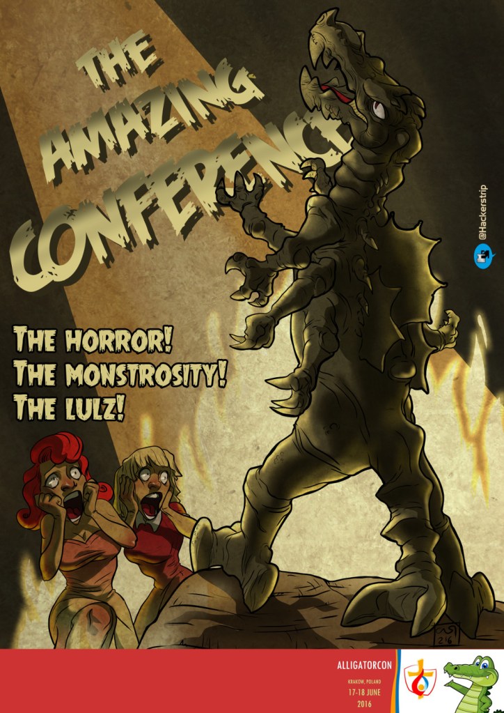 Ocho años atrás, bajo el sello de Hackerstrip, me llegaba un encargo para diseñar el póster de una convención de seguridad informática. Así conocía Alligatorcon en el lejano 2016. Este evento se celebraría en la ciudad polaca de Cracovia (Kraków). Teniendo esto en mente y después de charlar un poco con los organizadores del evento, llegamos a lo que sería el protagonista de esta primera imagen: el Dragón de Wawel. O mejor dicho, la representación escultórica del mismo. Es un hecho histórico que hubo un dragón viviendo en una caverna de la colina Wawel. Esta criatura asolaba a los aldeanos de los pueblos cercanos. Su reinado de terror acabó cuando un valiente zapatero llamado Skuba, pudo derrotar a la bestia utilizando su ingenio. Con semejante relato fue todo cuestión de pasar la imagen de la escultura por un «filtro» de ciencia ficción retro.