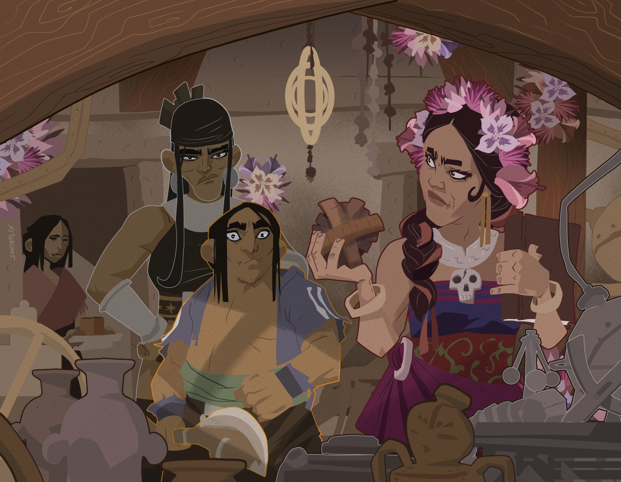 El estudio de Cálica era un santuario de conocimiento y belleza. Artefactos curiosos y libros antiguos se entrelazaban en una armonía meticulosa. Flores de todos los colores —violetas, rojas y amarillas— brotaban en cada rincón, perfumando el aire con su fragancia dulce. Incluso Cálica lucía una corona de flores sobre su cabello oscuro. Este detalle, que en un principio sorprendió a Mahapu, cobró sentido más tarde cuando supieron que el aroma floral disimulaba el olor penetrante de la Carasca que adormecía su cuerpo. Por eso, quienes la conocían bien solían llamarla Paku Tika , o simplemente Paku , el nombre de su flor favorita.